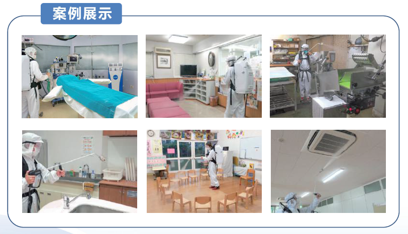● 适合于医院病床及手术室、食品加工操作间、儿童活动区、火车大巴等各类交通工具、含有重要电器的房间的快速消毒处理。