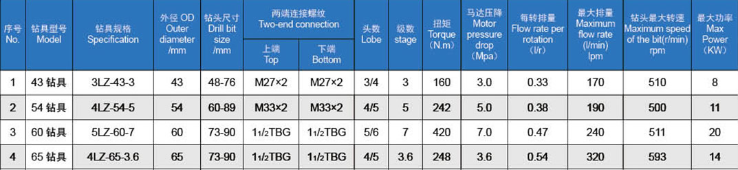 现有的小型号螺杆钻具有43、54、60和65型号,具体参数如下: